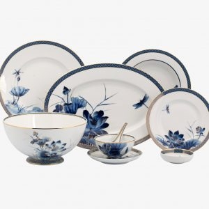 Khoác lên vẻ truyền thống, nền nã của loài hoa Á Đông nhưng lại không kém phần tinh tế hiện đại, những cánh sen bung tròn, phúc hậu ôm lấy nhụy đã được tái hiện sống động bằng màu xanh cobalt đặc trưng của cung đình Huế. Bức tranh chân thực và sống động về lá, cỏ và hoa sen như đưa người ngắm về với một làng quê Việt Nam vốn yên bình, trù phú… Nghệ nhân cũng khéo léo tạo nét vương giả bằng những chi tiết vẽ vàng 24k uyển chuyển trên từng cánh hoa, vành, tay cầm và nắp tạo nên sắc màu lấp lánh dưới sự phản chiếu của ánh sáng. Bộ sản phẩm thích hợp cho những buổi sum họp thân tình trong không gian yên bình, thư giãn vừa gần gũi vừa sang trọng.